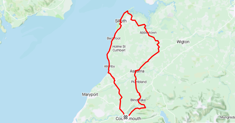 A round cycle heading north along the Cumbrian west coast to Silloth, returning on the inland route via Aspatria.